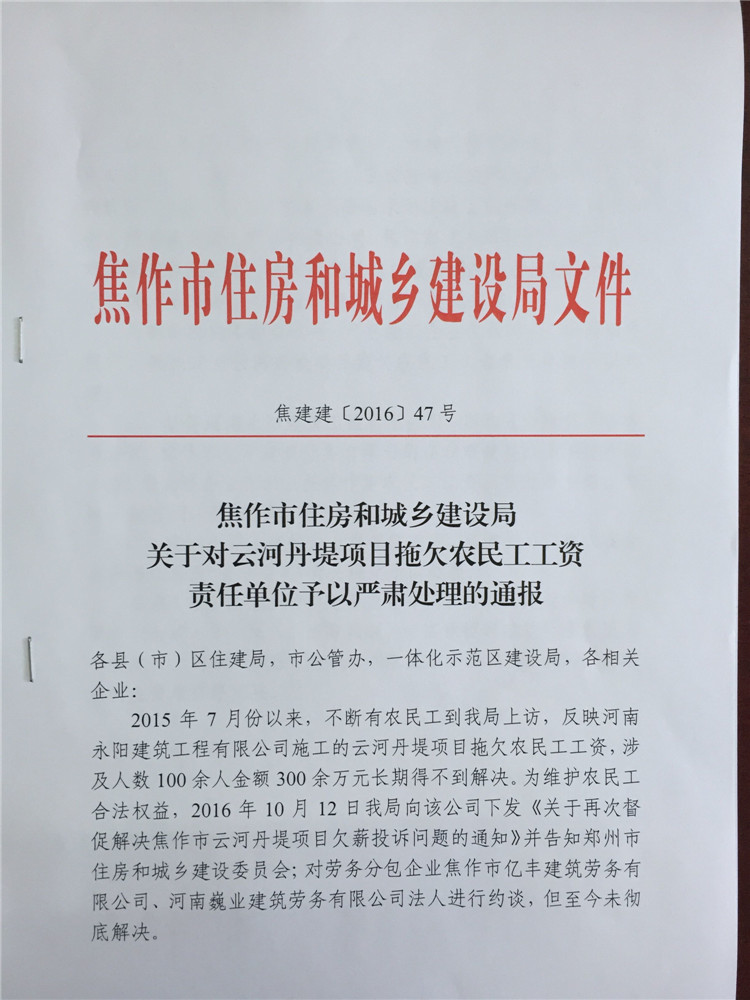 焦作市住房和城鄉(xiāng)建設(shè)局關(guān)于對云河丹堤項目拖欠農(nóng)民工工資責(zé)任單位予以嚴(yán)肅處理的通報