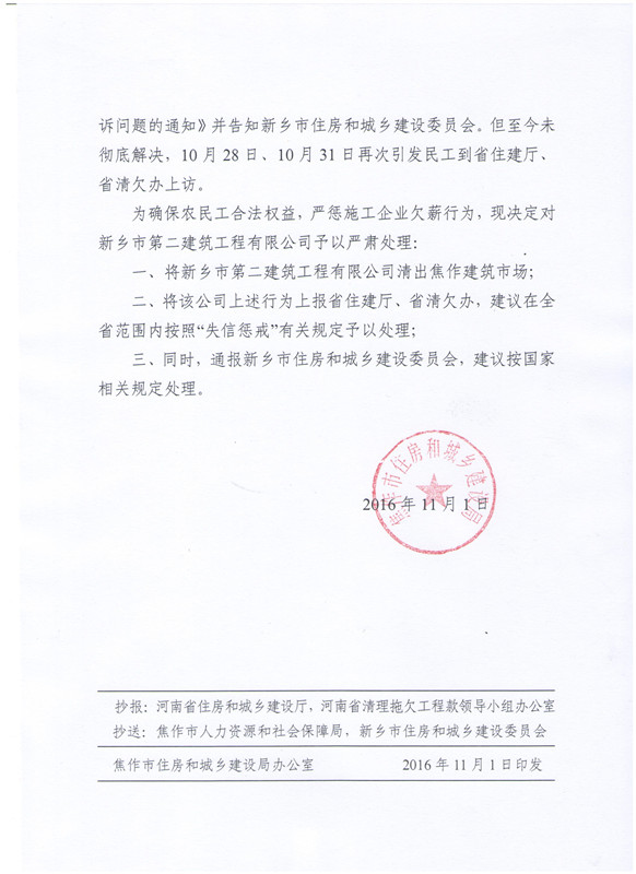 關(guān)于對新鄉(xiāng)市第二建筑工程有限公司予以嚴(yán)肅處理的通報