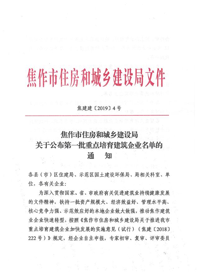 焦作市住房和城鄉(xiāng)建設(shè)局關(guān)于公布第一批重點培育建筑企業(yè)名單的通知