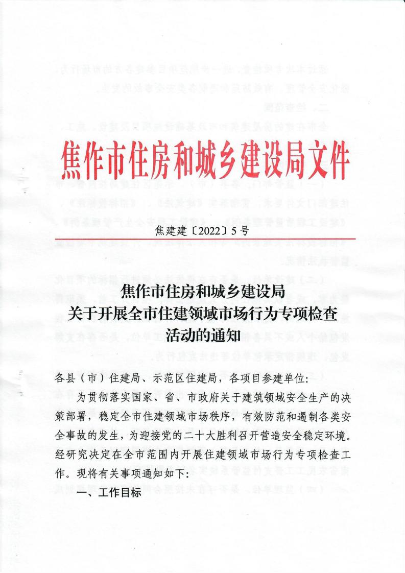 焦作市住房和城鄉(xiāng)建設(shè)局關(guān)于開展全市住建領(lǐng)域市場行為專項檢查活動的通知