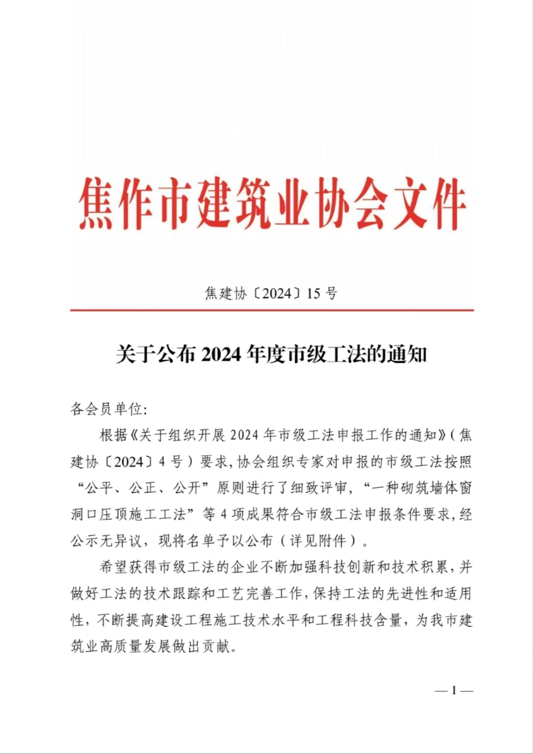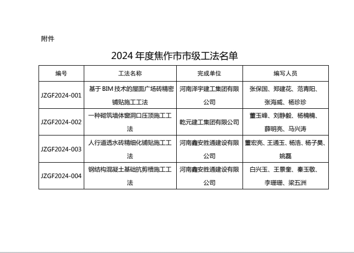 關(guān)于公布2024年度市級(jí)工法的通知