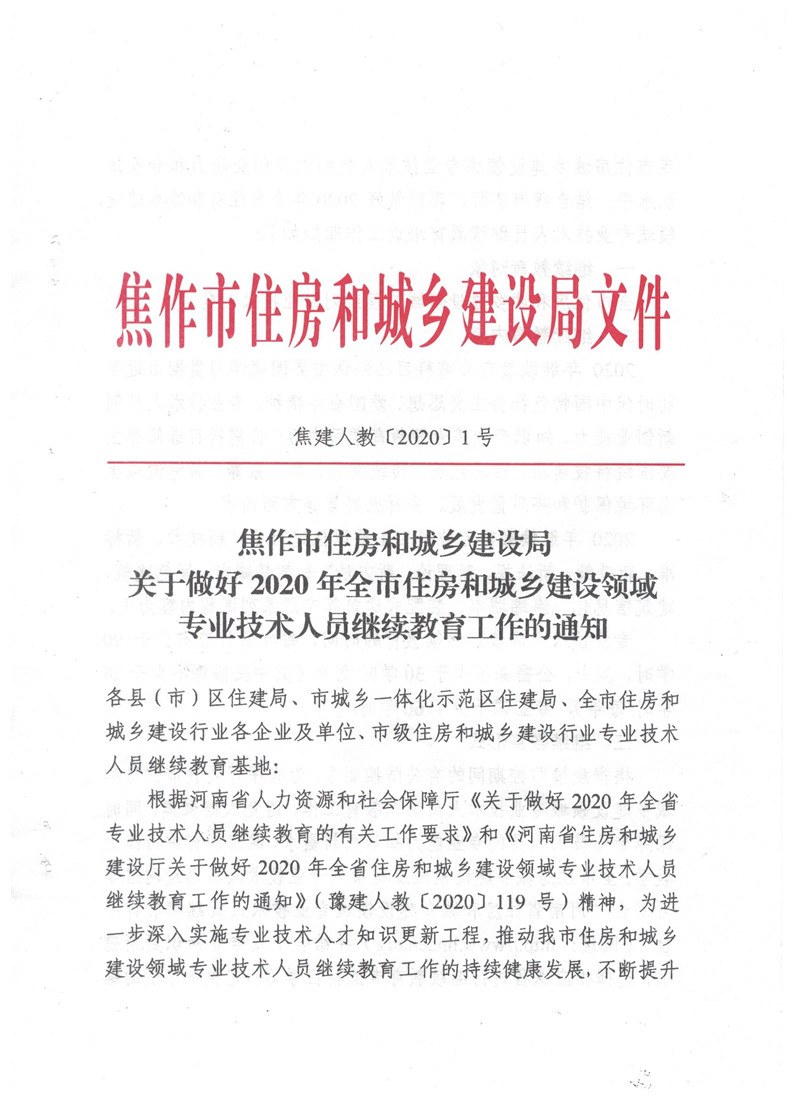 焦作市住房和城鄉(xiāng)建設(shè)局關(guān)于做好2020年全市住房和城鄉(xiāng)建設(shè)領(lǐng)域?qū)I(yè)技術(shù)人員繼續(xù)教育工作的通知